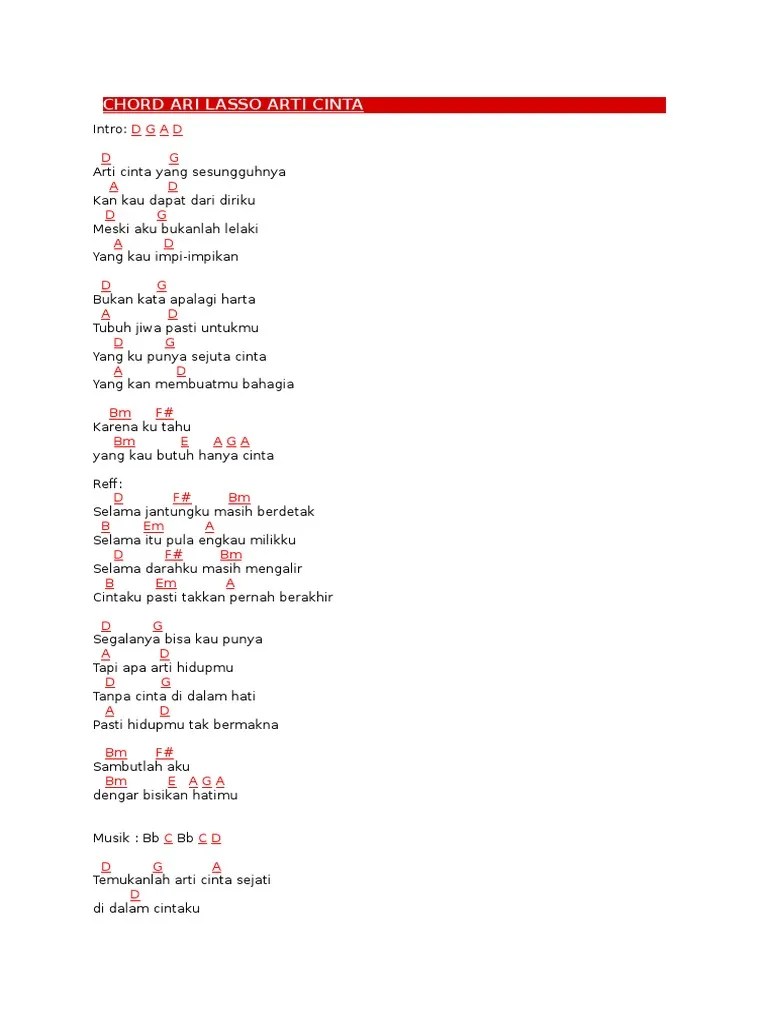 Chordify is your #1 platform for chords. A d 'kan kau dapat.dari diriku Chord kunci gitar lagu arti cinta dari ari lasso. Bukanlah lelaki g c yang. Yang sesungguhnya g c kan kau dapat. C f g c c f arti cinta. Play along in a heartbeat. Lirik dan chord arti cinta yang dipopulerkan oleh ari lasso. Dari diriku c f meski aku. D g arti cinta yang sesungguhnya. Chord ari lasso arti cinta.